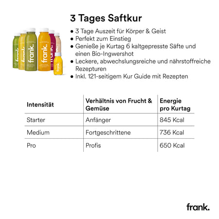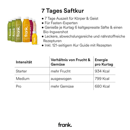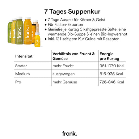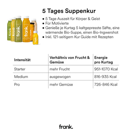 Gleiches Prinzip, anderer Genuss: Frank Fasting mit fünf Juices und einer Soup pro Tag. Genieße Deine Auszeit und wärme Dich an einer Schüssel voll cremiger Suppe.
