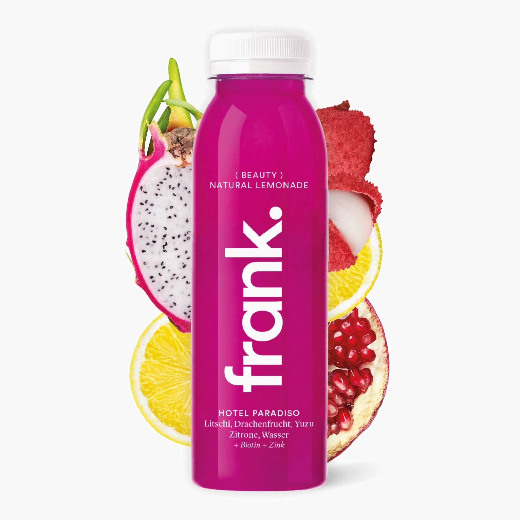 Zutaten: 65,5% Wasser, Litschipüree 20%, Drachenfruchtpüree 5%, Agavendicksaft 4,8%, Zitronensaft 4,2%, Yuzusaft 0,5%, Zinkbisglycinat 0,002%, Biotin 0,000002%