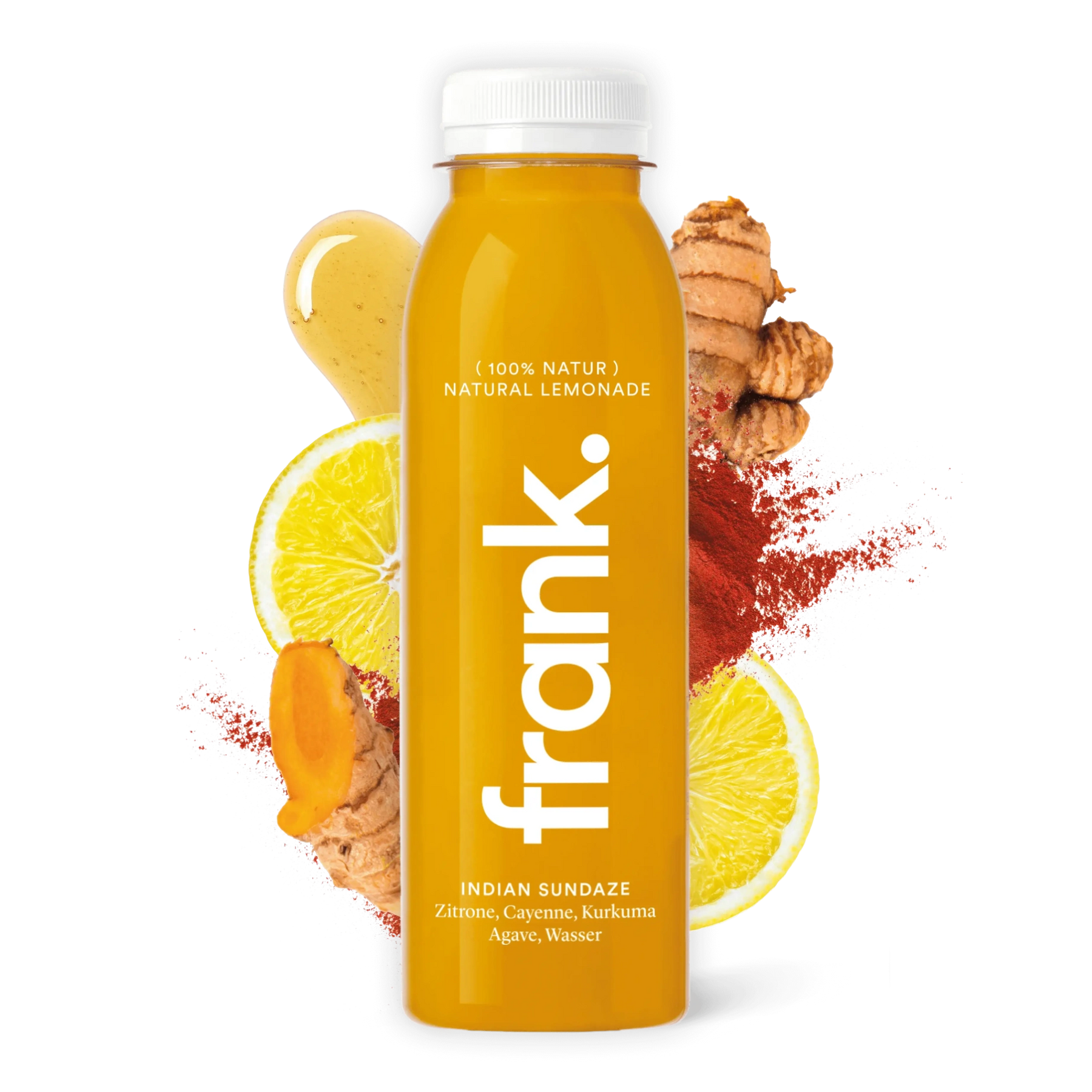 Darstellung des Saft Indian Sundaze mit Zitrone, Cayenne, Kurkuma und Agave in einem Glas von frank