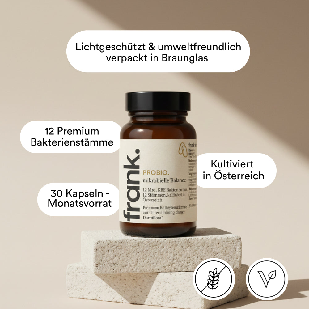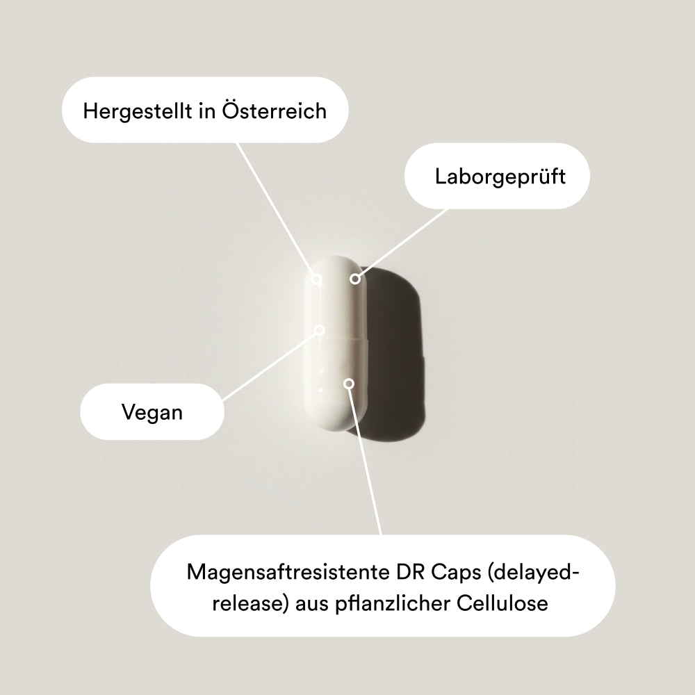 Nahrungsergänzungsmittel zur unterstützenden Versorgung mit zwölf ausgewählten Bakterienstämmen mit einer Gesamtkeimzahl von 12 Mrd. KBE.