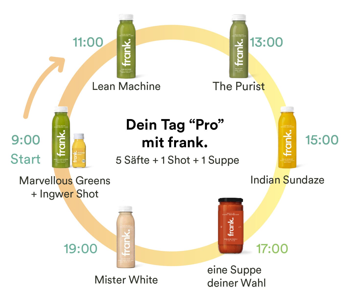 • fastest Du mehrere Tage am Stück und nimmst in dieser Zeit ausschließlich unsere Säfte und Suppen neben Wasser, Tee und Brühe zu Dir. Du versorgst mit den frank. Produkten Deinen Körper mit Obst und Gemüse in besonders leicht verdaulicher Form. Dazu enthält jeder Saft speziell ausgewählte Nährstoffe.
