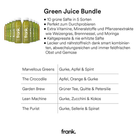 If you would like to try something new, we recommend our Juices tasting set! Here you get all 12 varieties of the finest cold-pressed frank. juices.