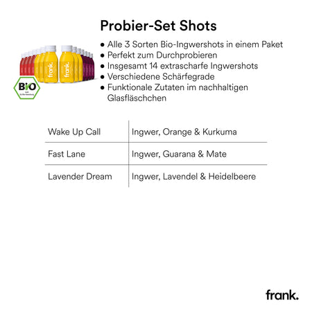 The Shot sample set contains our three different organic ginger shots! With different levels of spiciness, flavours ranging from fruity to sour and superfoods such as guarana, ashwagandha and curry leaf extract, you're sure to find your new favourite in your morning routine.