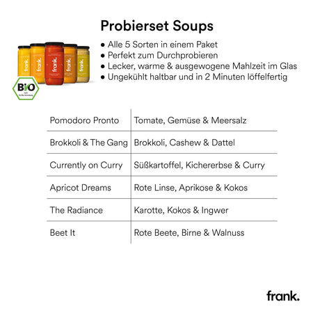 Of course, all tasting sets are in frank. Quality: regional and fresh fruit and vegetables, the finest spices and nutrient-preserving processing methods without additives or preservatives.
