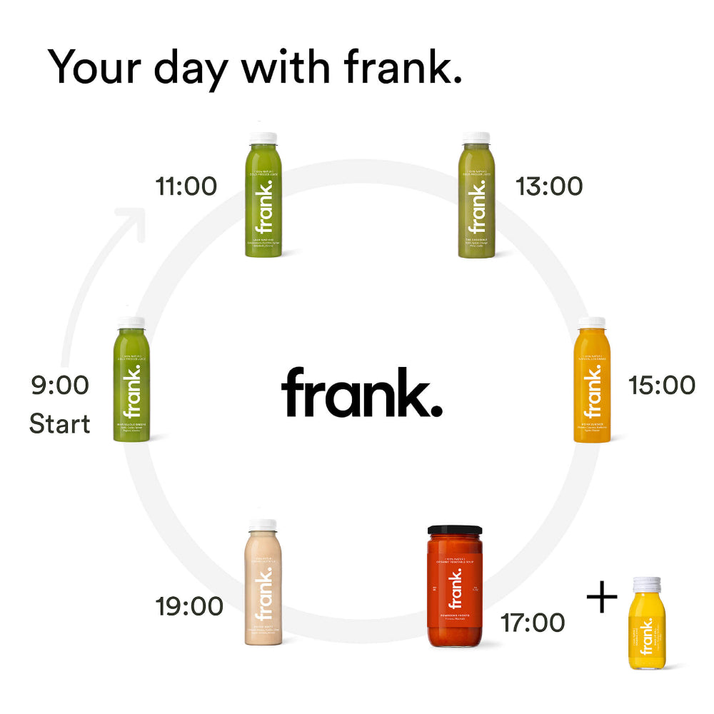 • fastest Du mehrere Tage am Stück und nimmst in dieser Zeit ausschließlich unsere Säfte und Suppen neben Wasser, Tee und Brühe zu Dir. Du versorgst mit den frank. Produkten Deinen Körper mit Obst und Gemüse in besonders leicht verdaulicher Form. Dazu enthält jeder Saft speziell ausgewählte Nährstoffe.