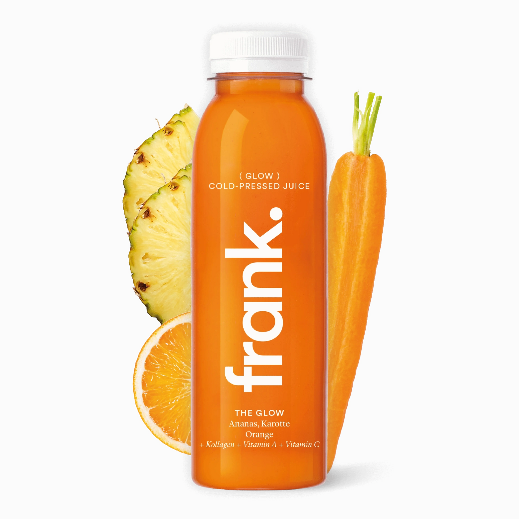 Classic juices are pasteurized to preserve them. This means that they are briefly heated to approx. 60 to 90°C to kill microorganisms and thus extend their shelf life. However, heat-sensitive nutrients are also destroyed in the process. The taste can also suffer! The juices from frank. are preserved using the HPP process. This means that the juices are exposed to high pressure instead of heat. This also kills microorganisms, but retains the concentration of nutrients as much as possible. What's more, frank. juices are of raw food quality! In addition to the nutrients from fruit and vegetables, you will find selected micronutrients for your well-being in the juices. In The Glow, for example, we have integrated vitamin C, collagen and vitamin A for your glow*.